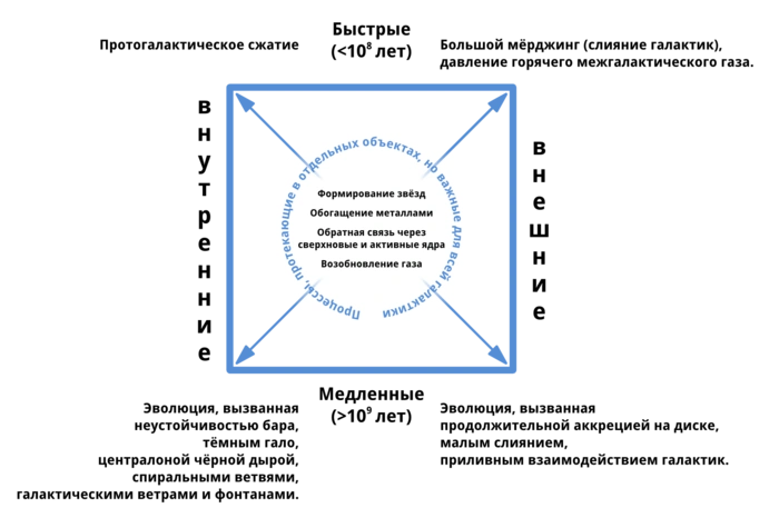 В центре диаграммы представлены важные этапы эволюции одной звезды, от её формирования до смерти. Их ход малозависим от того, что творится со всей галактикой в целом. Однако общее число вновь образующихся звёзд и их параметры подвержены значительному внешнему влиянию. Процессы, масштабы которых сравнимы или больше размера галактики (на диаграмме это все остальные, не вошедшие в центральную область), меняют морфологическую структуру, темп звездообразования, а значит и скорость химической эволюции, спектр галактики и т. д.
